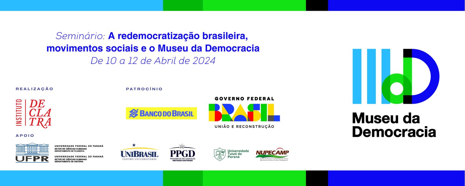 Inicia hoje, 10, o seminário “A redemocratização brasileira, movimentos sociais e o Museu da Democracia”, organizado pelo Instituto Defesa da Classe Trabalhadora (iDeclatra), com o patrocínio do Banco do Brasil, e apoio da Universidade Federal do Paraná (UFPR), do Centro Universitário UniBrasil e da Universidade Tuiuti do Paraná. O evento segue até o dia, 12, sexta-feira. “Será uma grande oportunidade para discutirmos temas fundamentais para a nossa democracia com professores e especialistas na área da cultura”, ressalta a presidenta do iDeclatra, Mírian Gonçalves e coordenadora-geral do projeto “Museu da Democracia”. Da mesma forma, um dos fundadores do iDeclatra, Wilson Ramos Filho (Xixo), destaca a relevância do seminário e da criação do Museu da Democracia. “É urgente resgatar os valores democráticos e o apreço à democracia brasileira”, reitera. Durante a abertura, o diretor do Instituto, Nasser Ahmad Allan, fará a apresentação inicial e representará toda a diretoria do iDeclatra.